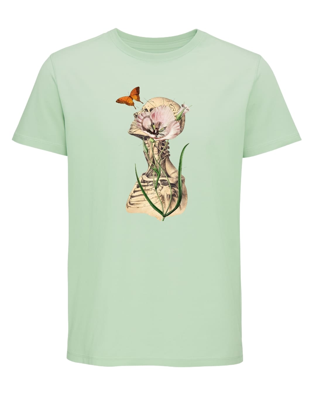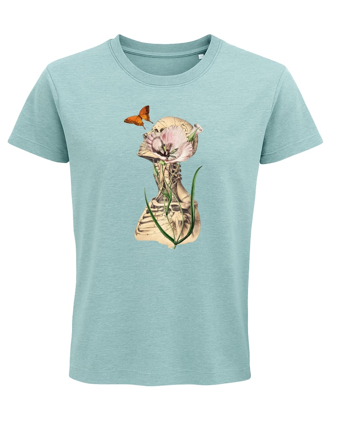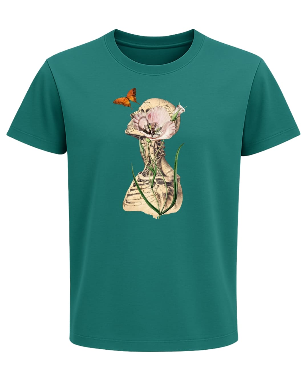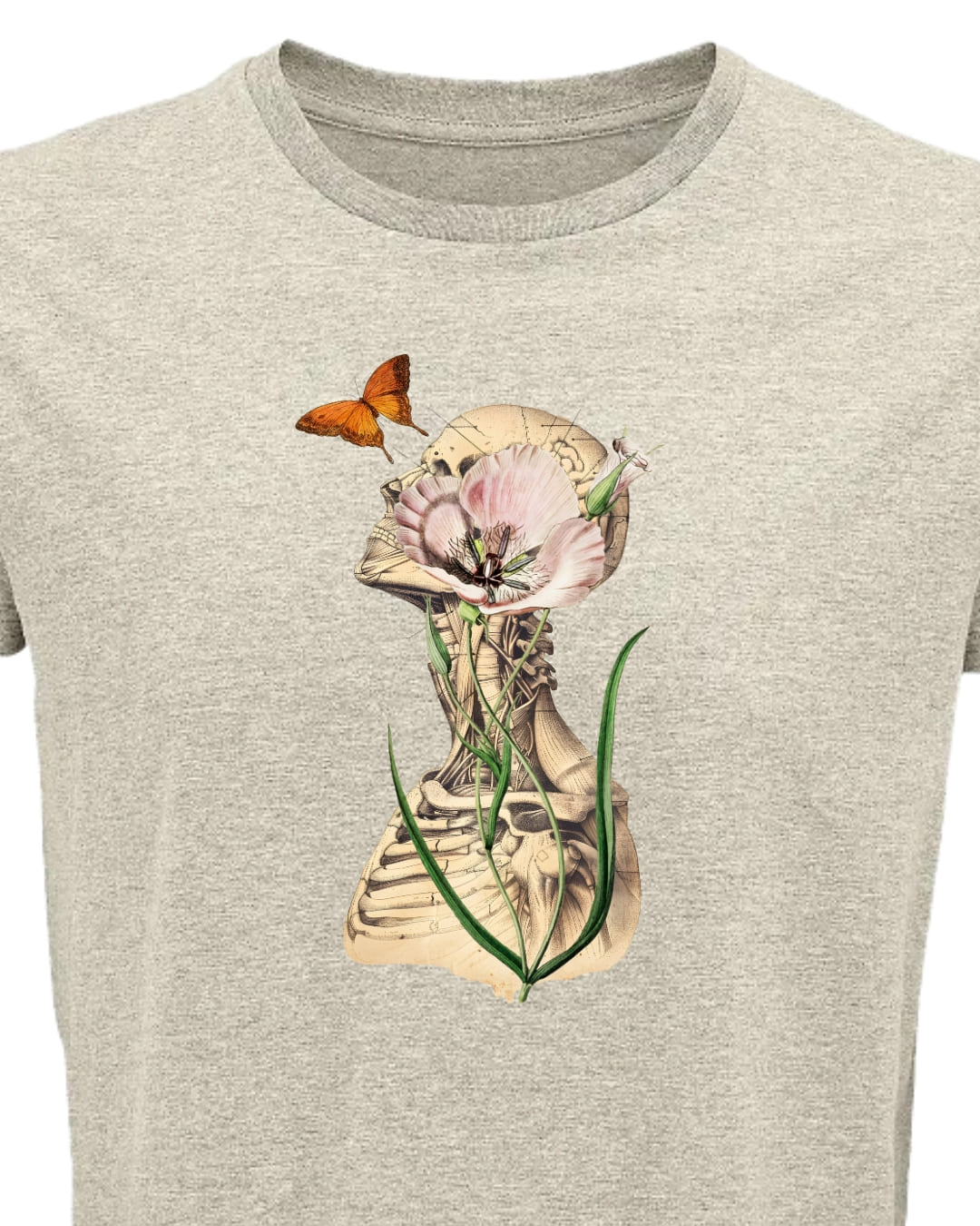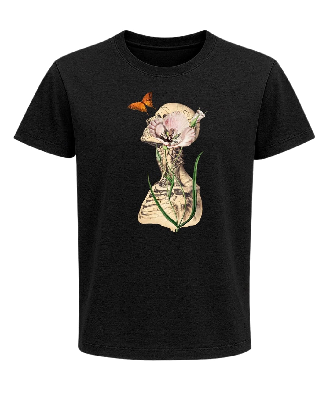 La Camiseta Algodón Orgánico – Botánic Anatomy es una pieza que transforma la anatomía en poesía visual. Su diseño fusiona la solidez del esqueleto humano con la delicadeza de las flores y la mariposa, evocando la dualidad entre lo eterno y lo efímero, lo fuerte y lo frágil.