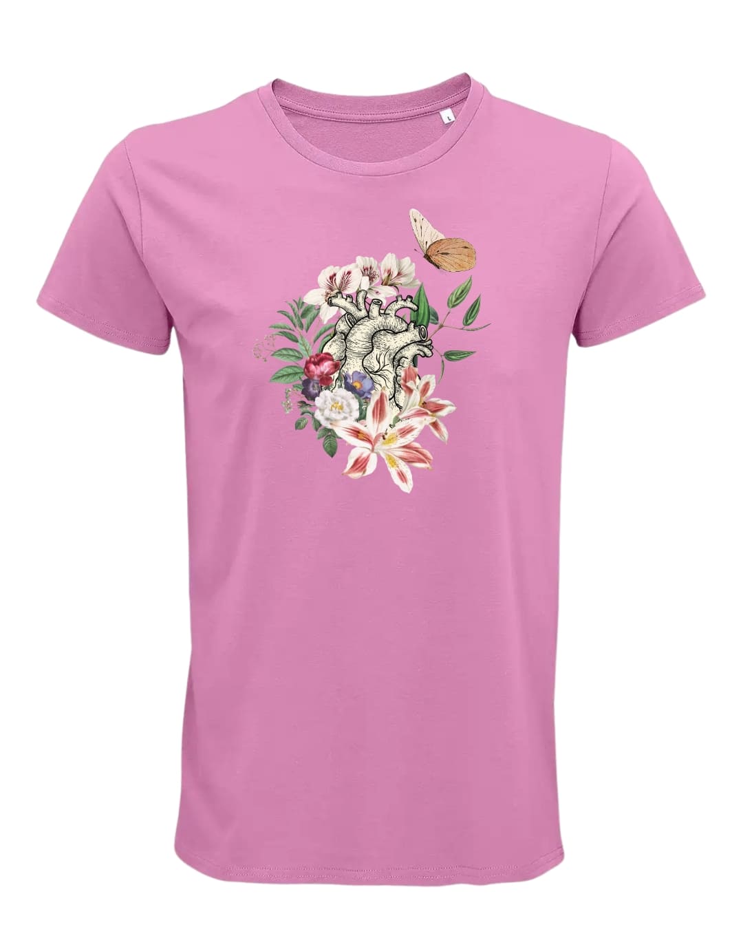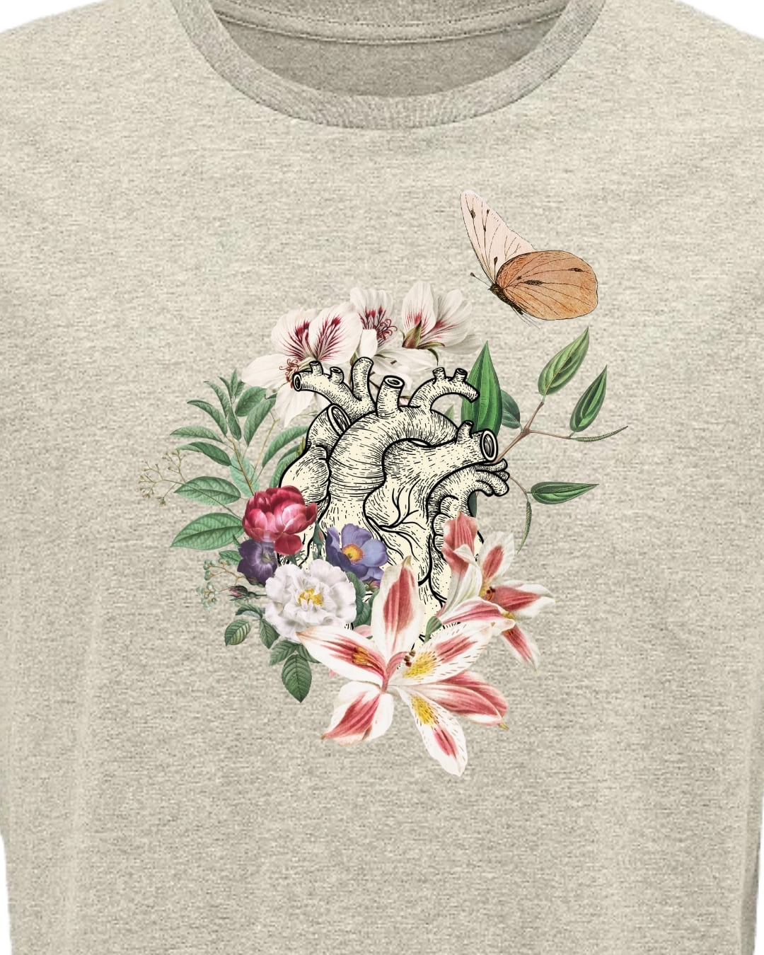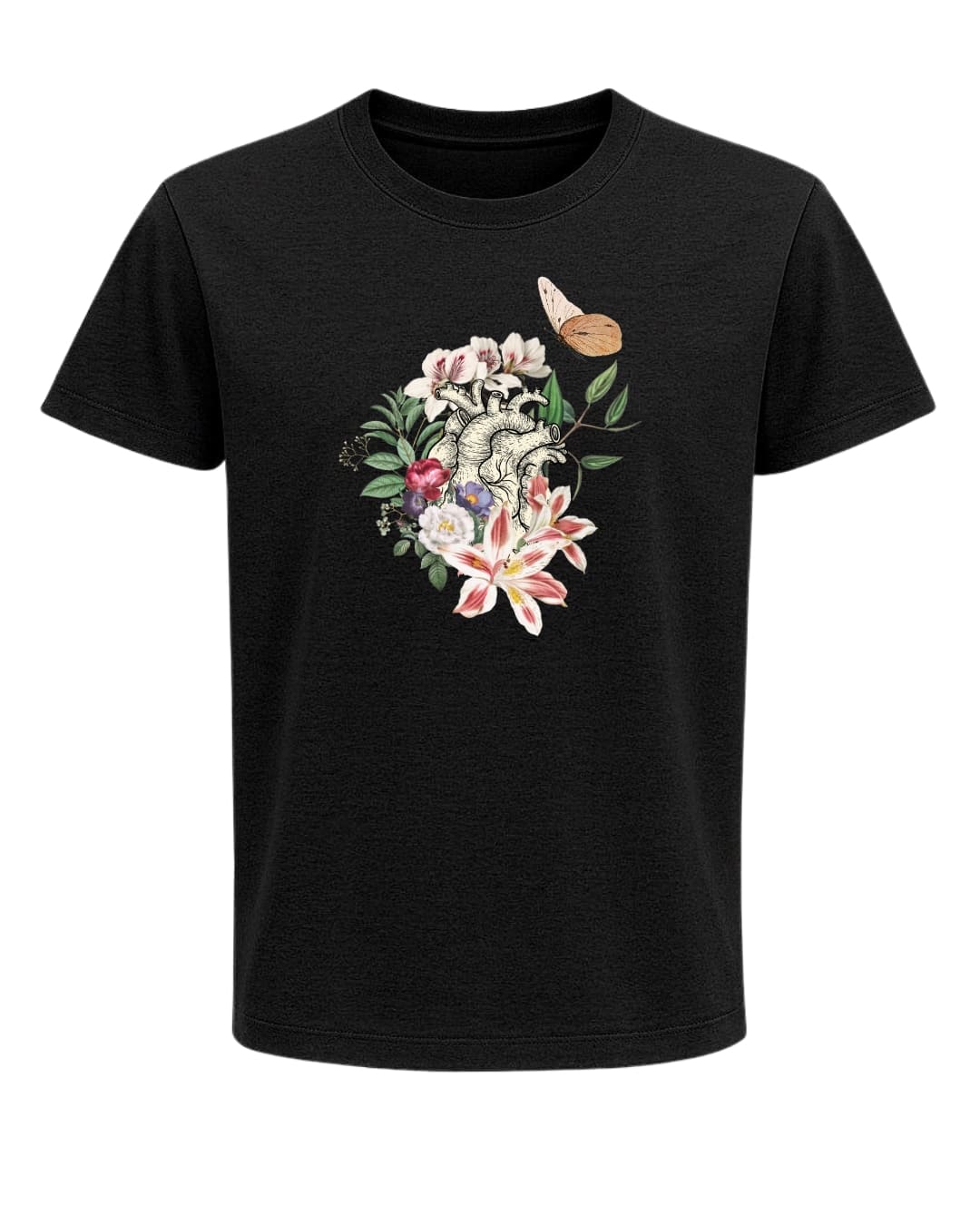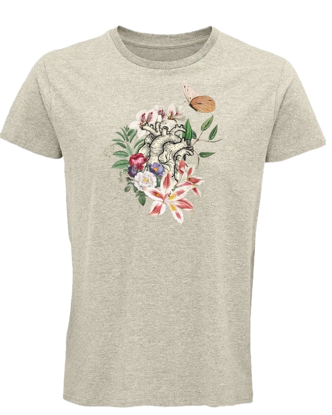 Camiseta Algodón Orgánico Corazón Botánico es mucho más que una prenda: es una declaración artística. Inspirada en la ilustración anatómica clásica, este diseño mezcla la fuerza del corazón humano con la delicadeza de las flores y la ligereza de una mariposa.