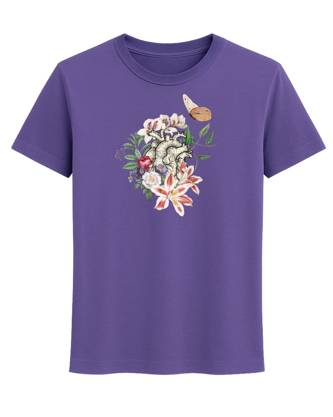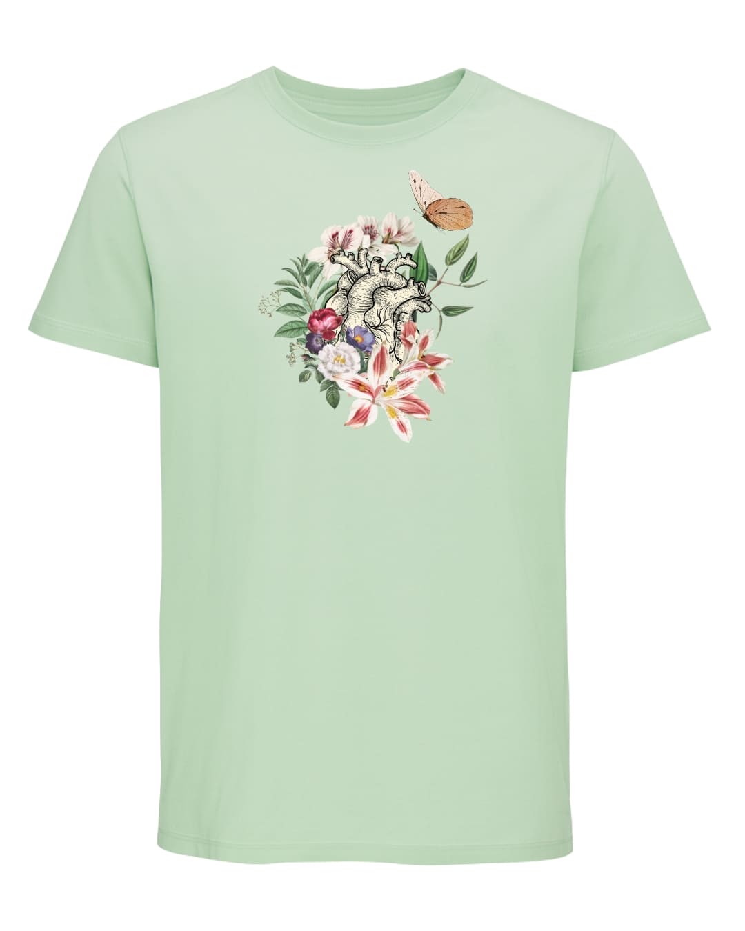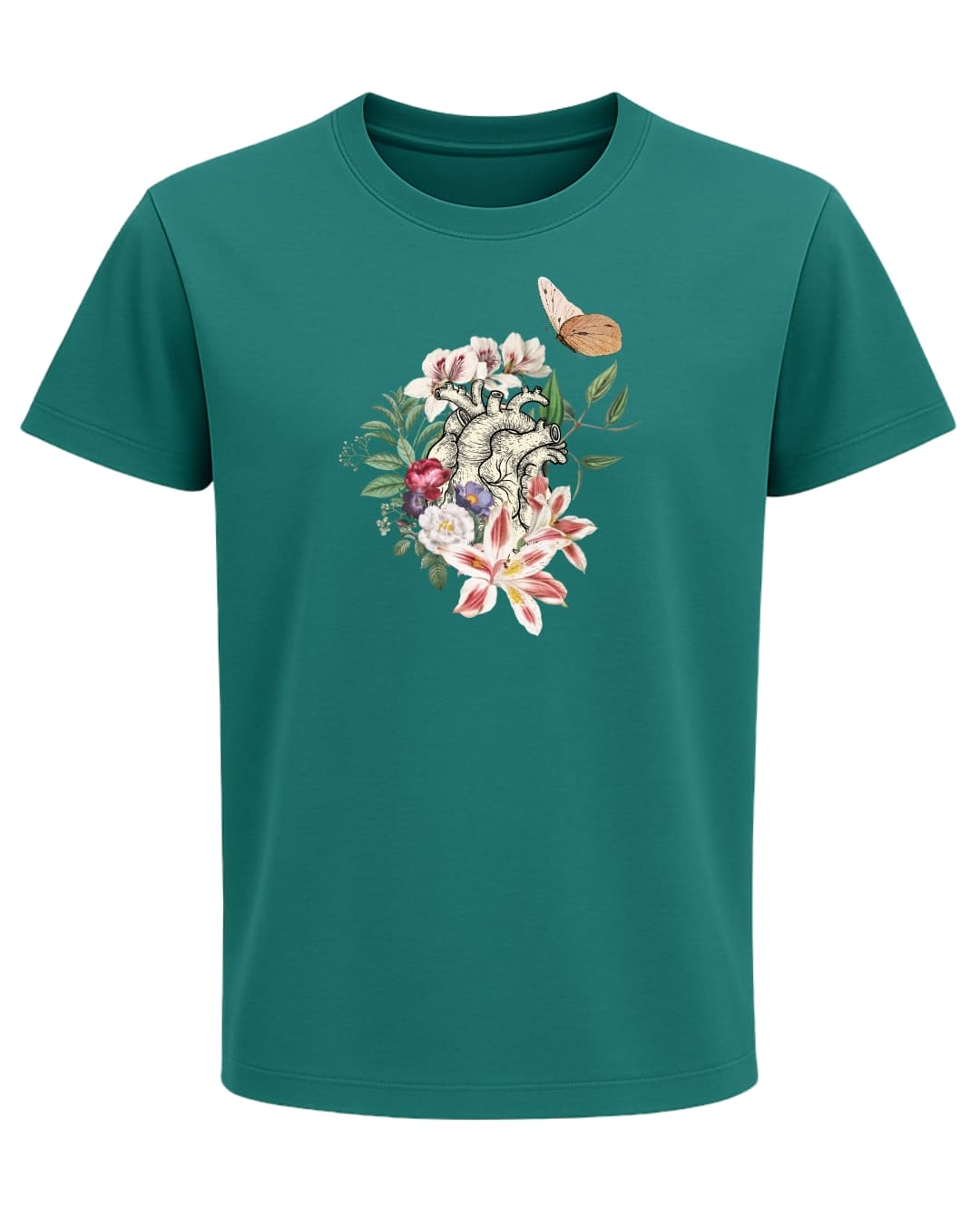 Camiseta Algodón Orgánico Corazón Botánico es mucho más que una prenda: es una declaración artística. Inspirada en la ilustración anatómica clásica, este diseño mezcla la fuerza del corazón humano con la delicadeza de las flores y la ligereza de una mariposa.