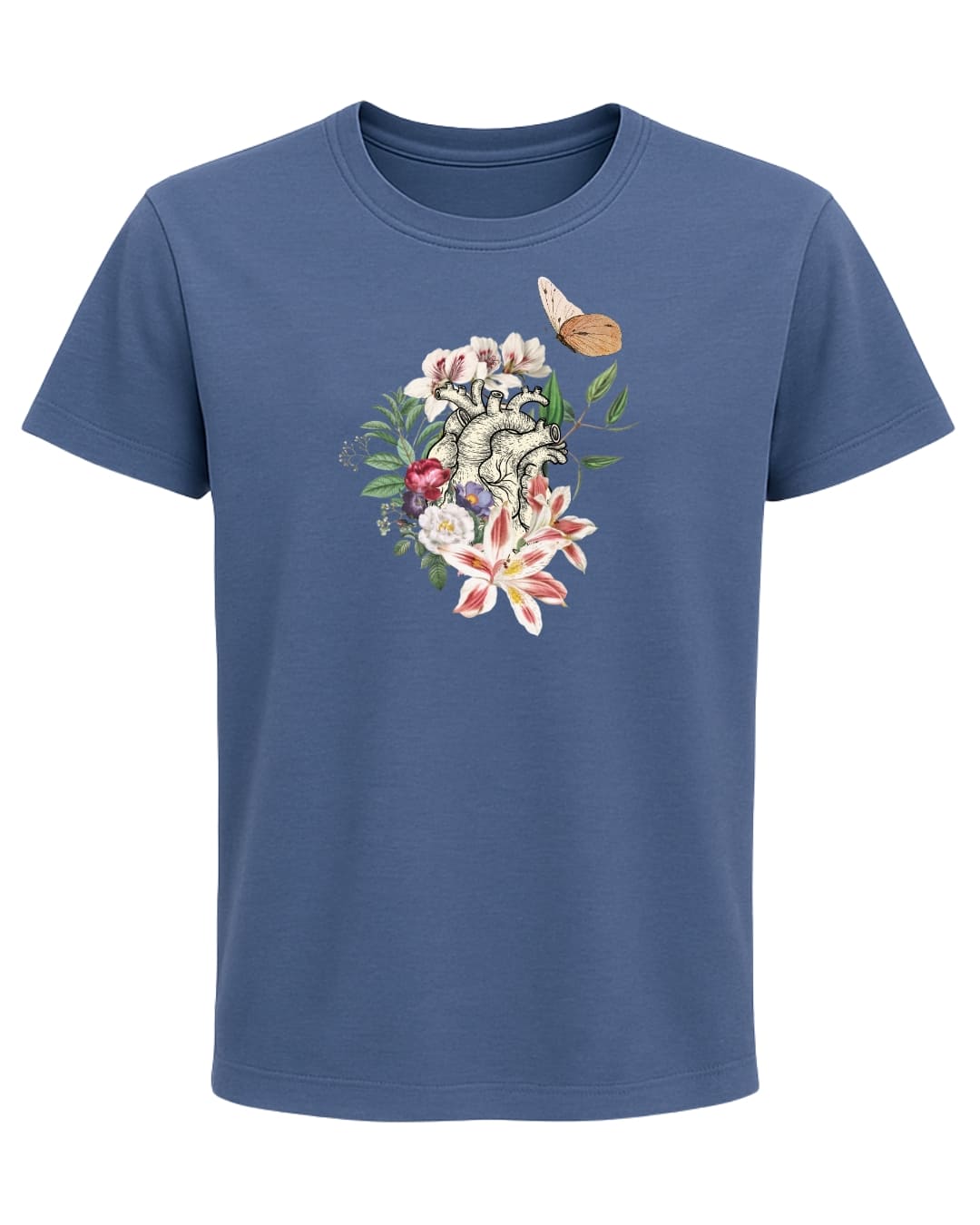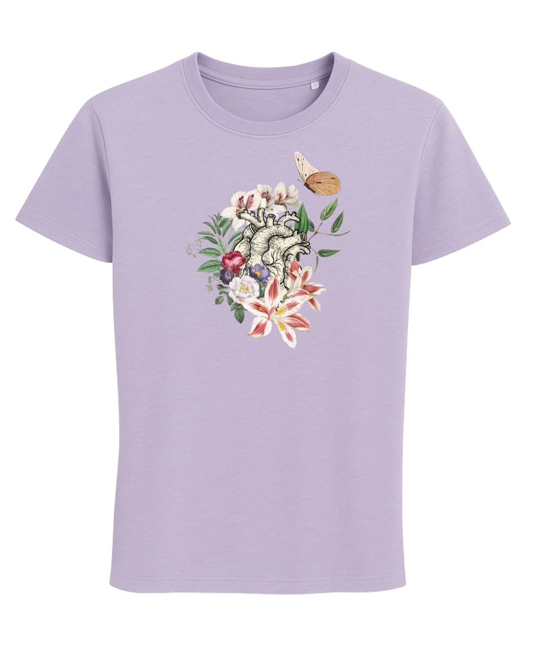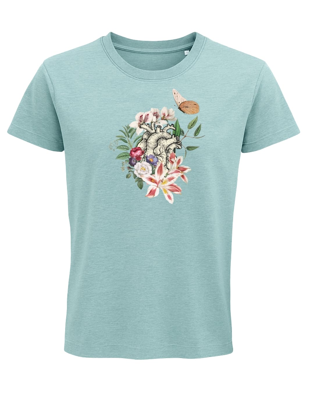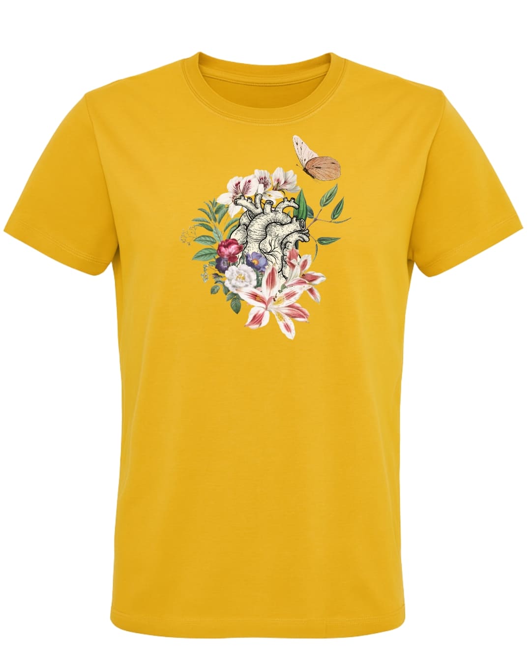 Camiseta Algodón Orgánico Corazón Botánico es mucho más que una prenda: es una declaración artística. Inspirada en la ilustración anatómica clásica, este diseño mezcla la fuerza del corazón humano con la delicadeza de las flores y la ligereza de una mariposa.