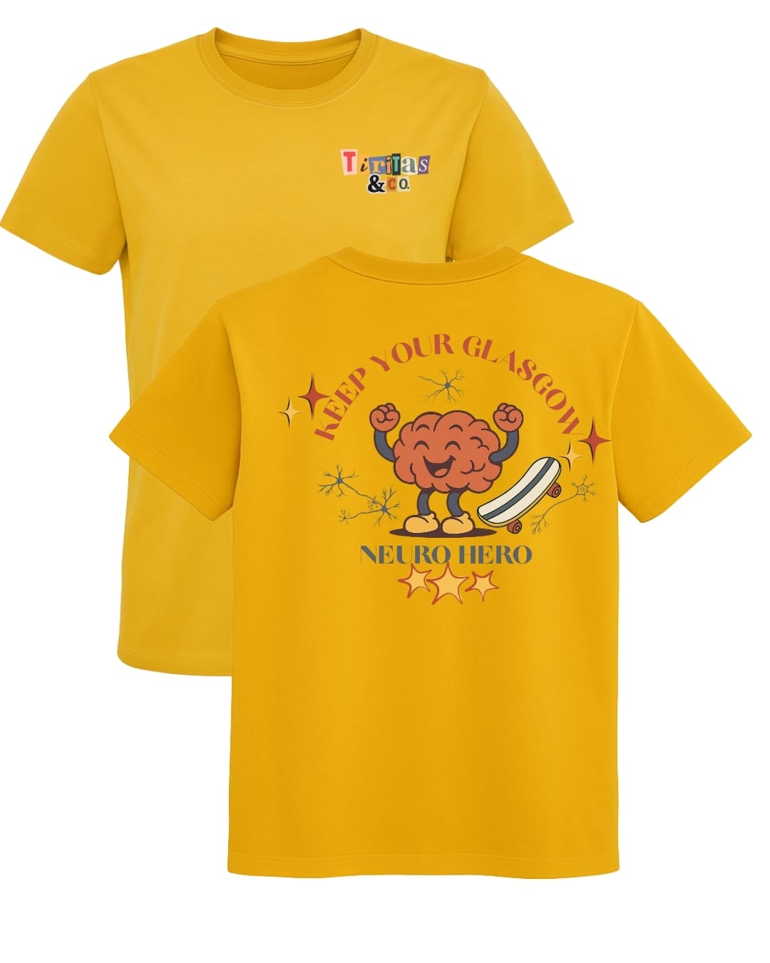 Con un diseño retro de un cerebro sonriente acompañado del lema “Keep Your Glasgow” y las estrellas de Neuro Hero, esta camiseta mezcla ciencia, humor y estilo urbano.